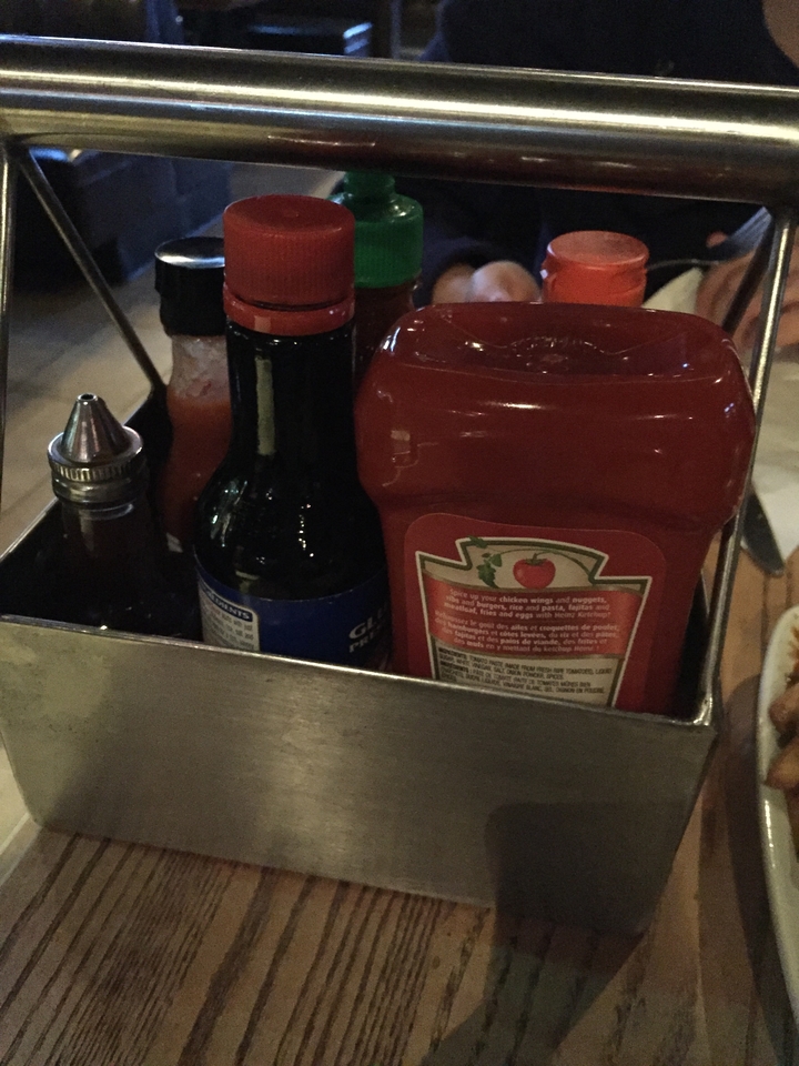 We get to the hotel and settle in a bit. It's dinnertime, so we decide to search for food. After some Yelping, we end up at a place called Original Joe's. Seemed like your typical restaurant/bar place. Sadly, the local townsfolk did not have very noticable accents. That's besides the point. We ordered a burger of some sort and, of course, had poutine. This place also brought out a caddy of condiments to go along with the poutine. Ketchup, soy sauce, hot sauce, malt vinegar, and a couple other ones I can't remember. The poutine is pretty good on its own (delicious gravy!), but I liked the ketchup addition. Another weird thing about Canada is that when you pay with a credit card, they make you swipe it. Seems much more secure, but to be honest, it wasn't something I considered before.
